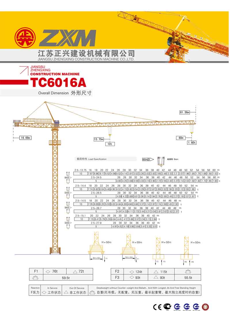 2、最大工作幅度60米,最大起重量8噸,末端最大起重量1.6噸,額定起重力矩1250KN.M;